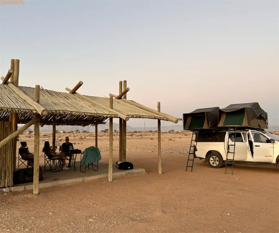 Sossus Oasis Camp Site in Namibië is een bijzondere plek om te kamperen met het gezin. Je verblijft pal naast de duinen van Sossusvlei, mét zwembad en privé sanitair.