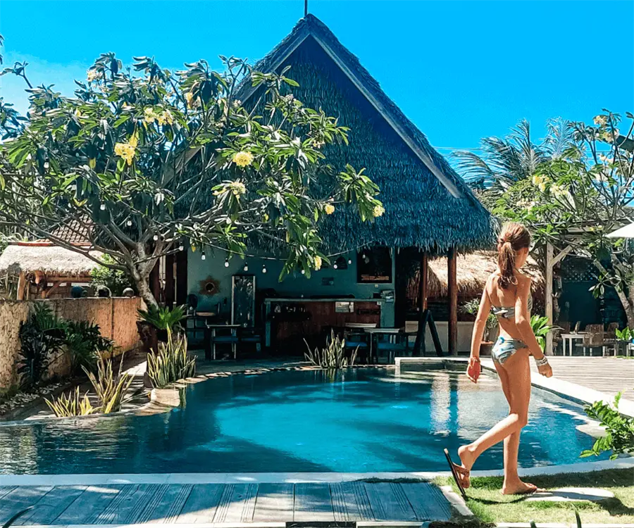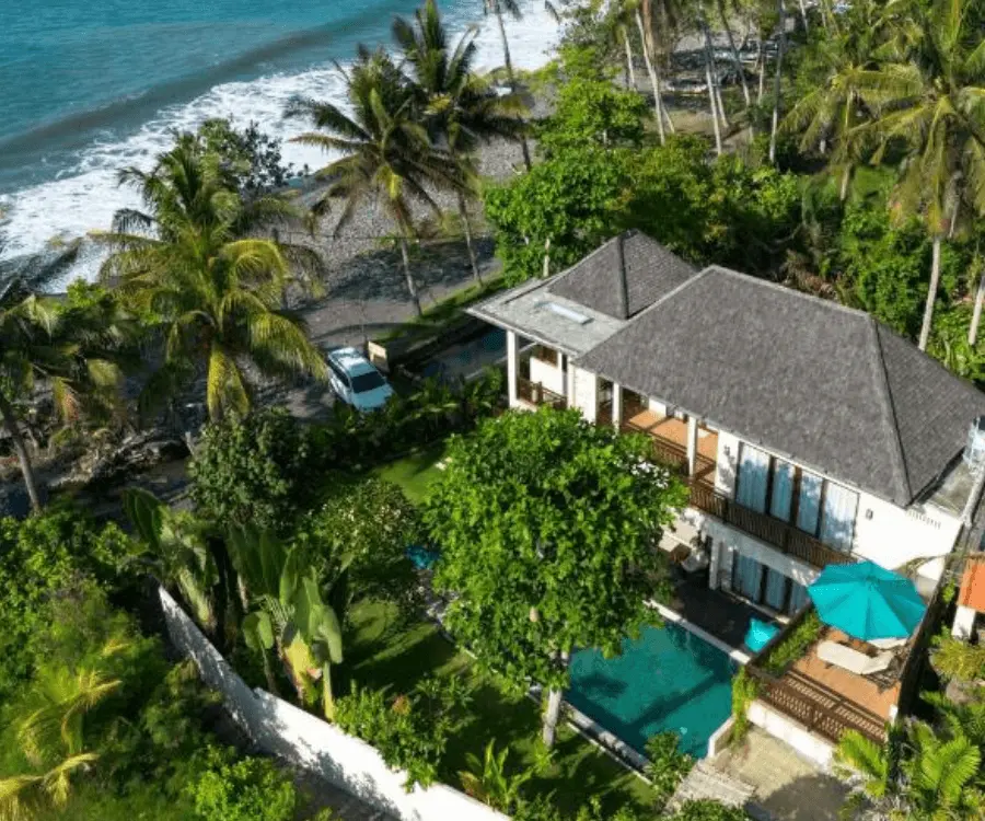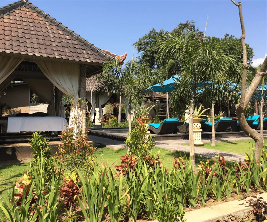 Op loopafstand van Mushroom Beach ligt The Palm Grove Villas: een kindvriendelijk resort in Indonesië met twee zwembaden, een tropische tuin en een ontspannen sfeer waar gezinnen zich meteen thuis voelen.