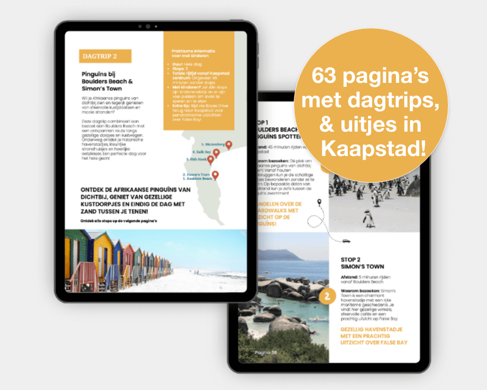 Bekijk ook onze digitale gids Kaapstad voor gezinnen! 63 pagina’s vol insider tips, kant-en-klare dagtrips, 20 kindvriendelijke restaurants en de leukste uitjes. Gemaakt door ouders, voor ouders.