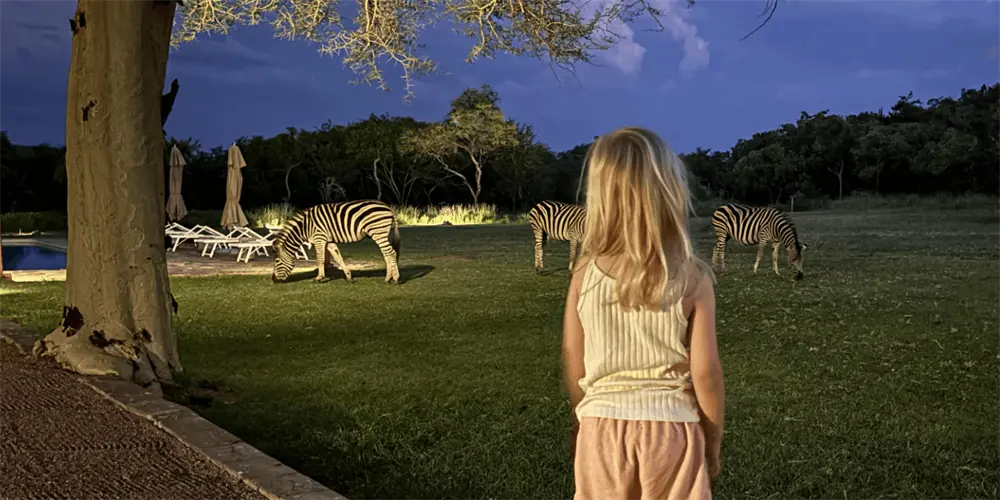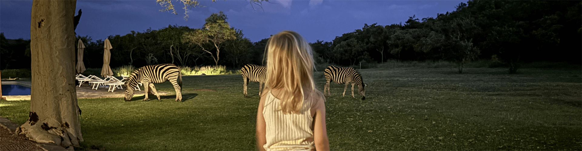 Dieren zoals zebra’s komen zodra de zon ondergaat dichtbij (zijn niet tam) en het is echt een bijzondere ervaring om een diner te hebben met de zebra’s zo dichtbij het terras. Wil je graag de Big 5 spotten en opzoek naar grotere dieren dan kunnen we een verblijf bij Elephants Crossing in Welgevonden aanraden, daar zijn speciale kindersafari’s mogelijk; de kiddies drive.