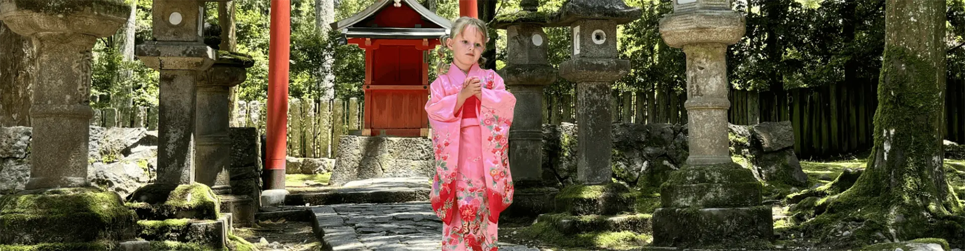 We bezochten in het centrum van Nara een kimono winkel, want onze dochter wilde graag verkleed in traditionele kleding. Er was gelukkig nog een plekje voor haar vrij en in een uur tijd kreeg ze een prachtige kimono aan en werden haar haren gedaan. Dit was echt een hele toffe ervaring.