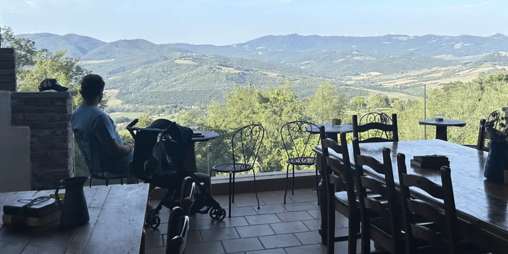 We dronken hiernaast de wijnen ook heerlijke biertjes uit de streek en genoten van Italiaanse hapjes. Het uitzicht was ontzettend mooi, je keek uit over het mooie landschap, toen we er zaten zagen we zelfs een zwijnen familie voorbij lopen en een klein hertje. Ons zoontje genoot hier natuurlijk ook volop van, en de bonus voor hem was, is dat ze een lieve huiskat hebben waar hij mee kon kroelen.